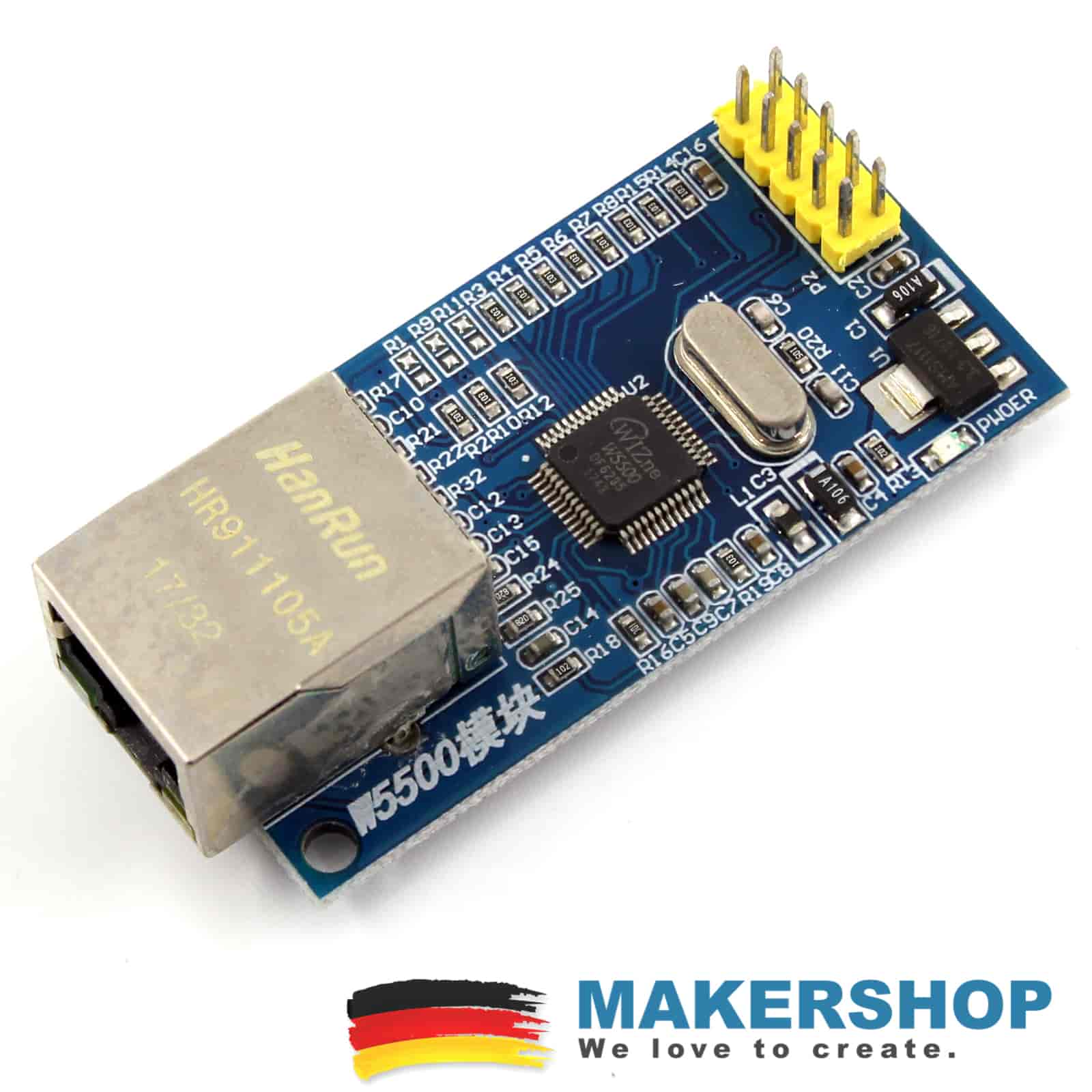 Kompaktes Modul mit Wiznet W5500 Chipsatz, um z.B. Arduino Boards über Netzwerk-Verbindung anzusprechen.
