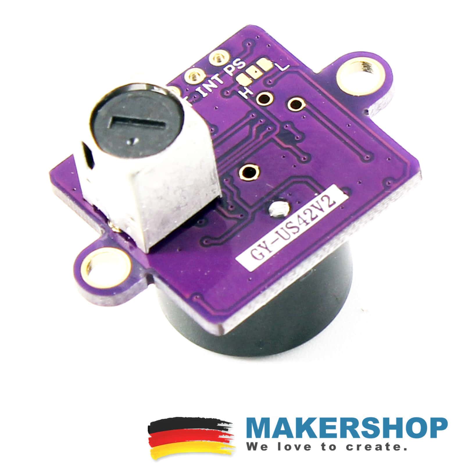 Der GY-US42 Ultraschall-Sensor ist ein hochpräziser Sensor zur Messung von Entfernung. Der Bereich für die Messung liegt hierbei bei 20cm – 720cm bei 5 Volt Eingangsspannung. Die Auflösung der Messung betragen 1cm. Der GY-US42 läßt sich allerdings nicht nur mit 5 Volt betreiben, sondern ist auch für 3.3 Volt Versorgungsspannung ausgelegt.